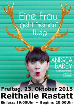 Andrea Badey hat den Soul auf den Zähnen und treibt Schabernack mit uns. Sie spielt, erzählt und ersingt uns die wundersam-skurille Welt des Badey-Landes. Aus der Sicht einer Frau mit Hirschgeweih begibt sie sich auf die kabarettistisch-komische Suche des optimalen Weges. Was könnte das sein? „Ihrer“ „Seiner“ oder doch der des selbsternannten Jonny Depp und Abenteurers „Harry Hirsch“, … der wiederum erklärt einem buddhistischen Goldfisch die Welt: „Bei manche Mädels haste Pech, weil du bei denen farblich einfach nicht in die Wohnung passt“. Andrea Badey zeigt dem Teufel, was `ne Harke ist … und erzählt das alles mit einer umwerfenden Liebe zum Lachen, zum Hinschauen und weicht den Zumutungen des Lebens dennoch mit gekonntem Hüftschwung aus. Und … ihr spezieller Ruhrgebietszauber tropft dabei aus allen Knopflöchern …