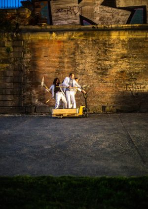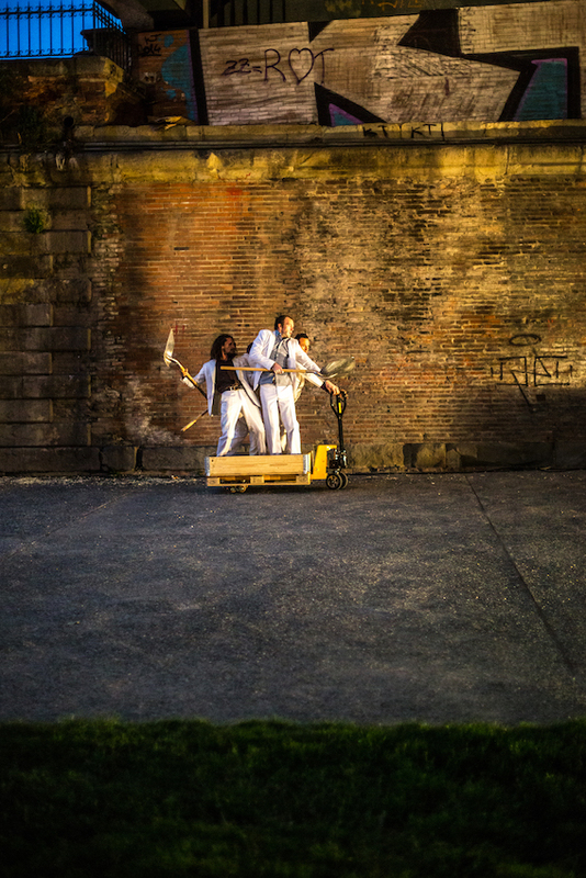 In ihrer neuesten Produktion schickt G. Bistaki das Publikum auf eine atemberaubend choreographierte und musikalische Reise. Die Gruppe nutzt den öffentlichen Raum, um ein absurdes traumartiges Panorama unserer heutigen Gesellschaft zu schaffen. Vier Männer in weißen Anzügen erscheinen: Bewaffnet mit Schneeschiebern verwenden sie Mais als Diskussionsquelle für ihre Anliegen. In einer Mischung aus Tanz, Objekttheater und Jonglage kreieren sie fantastische Szenen und eine surreale Welt.