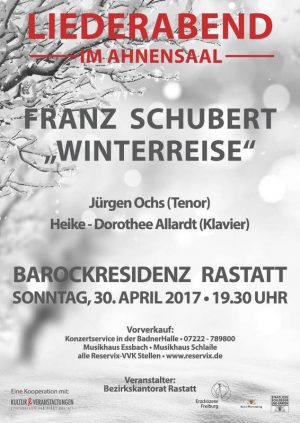 Die Pianistin Heike-Dorothee Allardt ist Dozentin für Liedgestaltung an der Hochschule für Musik in Karlsruhe, der Tenor Jürgen Ochs ist neben seines Bezirkskantorenamtes Dozent für Gesang an der Hochschule für Kirchenmusik in Rottenburg. Das Lied-Duo musiziert den beeindruckenden Liederzyklus am 30. April um 19.30 Uhr im Ahnensaal der Barockresidenz.